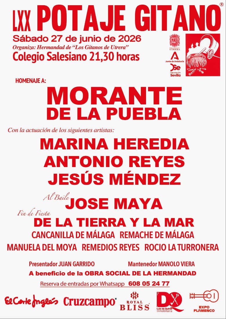 La ciudad de Utrera volverá a celebrar una de sus citas culturales más emblemáticas con la LXX edición del Potaje Gitano de Utrera, considerado el festival flamenco más antiguo de España. La cita tendrá lugar el 27 de junio en el patio del Colegio Salesianos, donde cada verano se reúnen cientos de aficionados al cante para disfrutar de una noche dedicada al flamenco más auténtico.